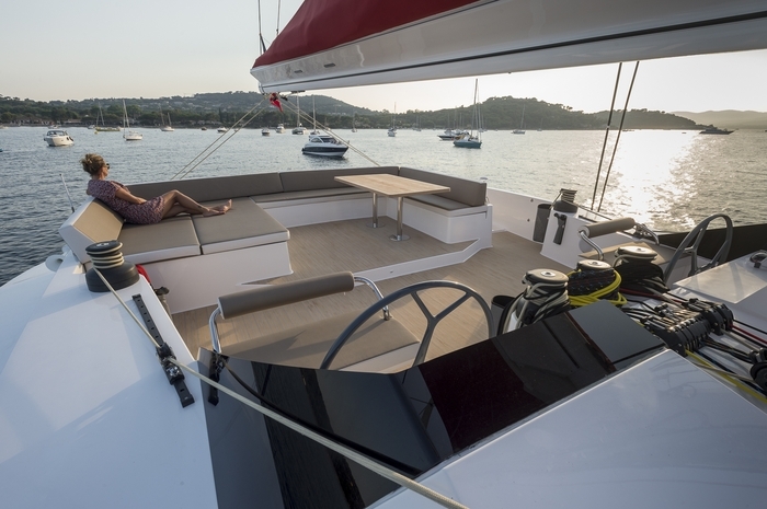 Performing under sail and comfortable at sea, the trimaran is THE solution for a unique sailing cruising experience ; the size of living spaces is comparable to that of a motor-yacht over 100 feet. This multihull also takes the codes of this type of ship : real technical area located inside and behind the central hull, tender garage, large storage boxes in the back of the floats, "professional" kitchen,