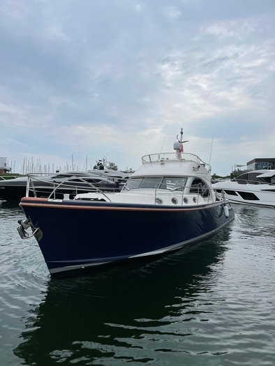 Key points : turn head design strongly inspired by the lobster boats, strong building, hydraulic swimming and tenderlift platform ; stability & seakeeping at high (35knots), cruising (20knots), low economical speed (9knots), including at anchor ; major refit in 2019 with new starboard engine, port engine completely overhauled, generator overhauled, new air conditioning, new electronic, new outside teak deck and furniture, ….