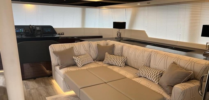 She features a bimini covered in solar panels which enable the lithium battery bank to be charged and operate the yacht's night-mode system which means that air conditioning, lighting, entertainment systems, etc,